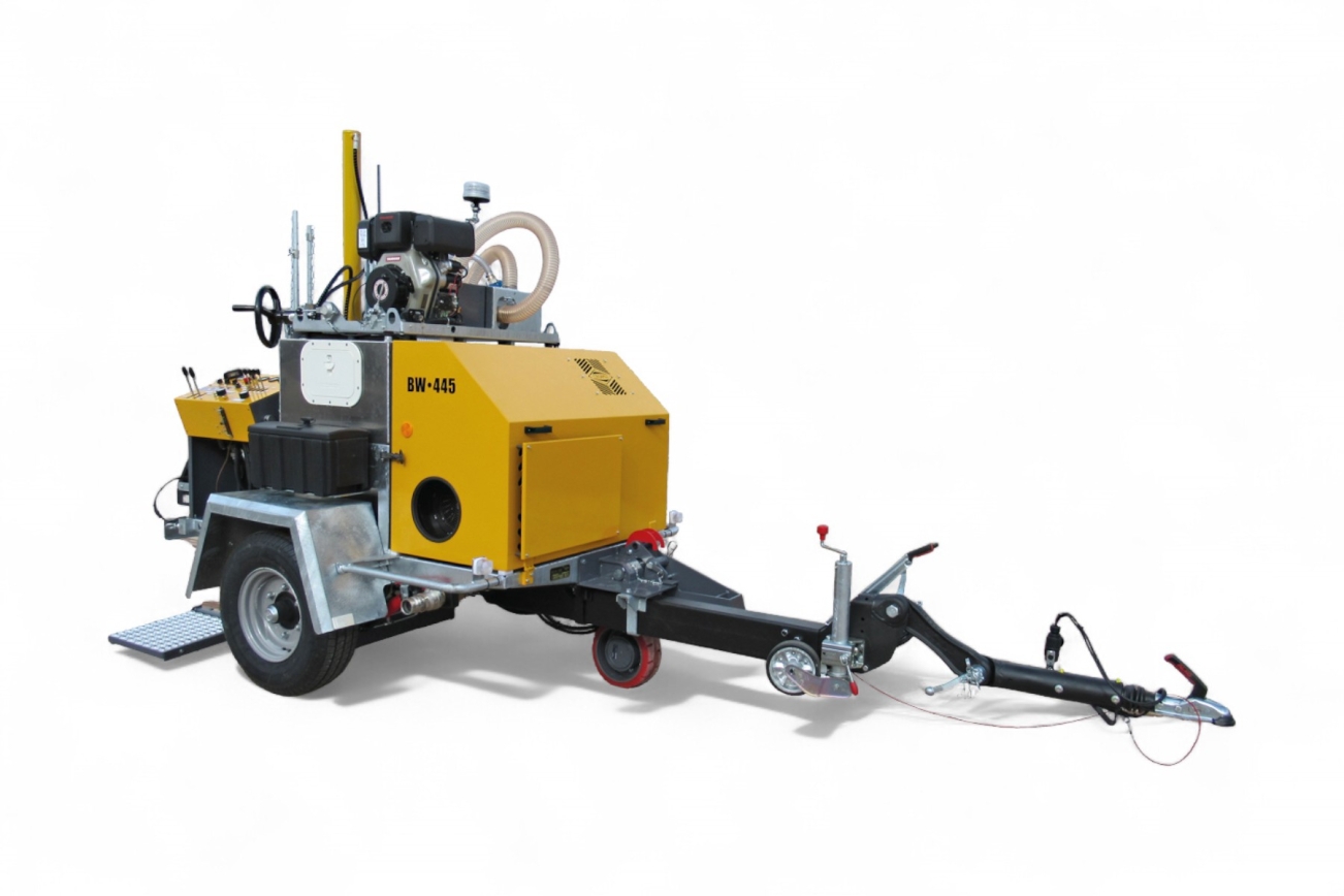 Auch der Transport ist durchdacht gelöst: Der BW-445 ist auf einem stabilen Fahrgestell aufgebaut und mit einer höhenverstellbaren Deichsel sowie wechselbarer Kugel- oder Ringösenkupplung ausgestattet. Mit einer Zulassung bis 100 km/h ist der Bohranhänger für den sicheren Straßentransport in der Schweiz bestens vorbereitet..