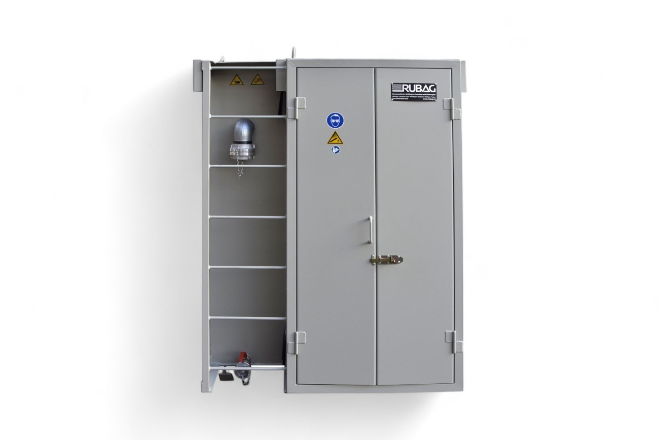 Technik- und Gasschrank: Der integrierte Technik- und Gasschrank bietet eine sichere Aufbewahrung der Gasflaschen und automatischen Neutralisationsanlage. Ebenfalls direkt im Technikschrank befindet sich die pH-Sondenentnahme.