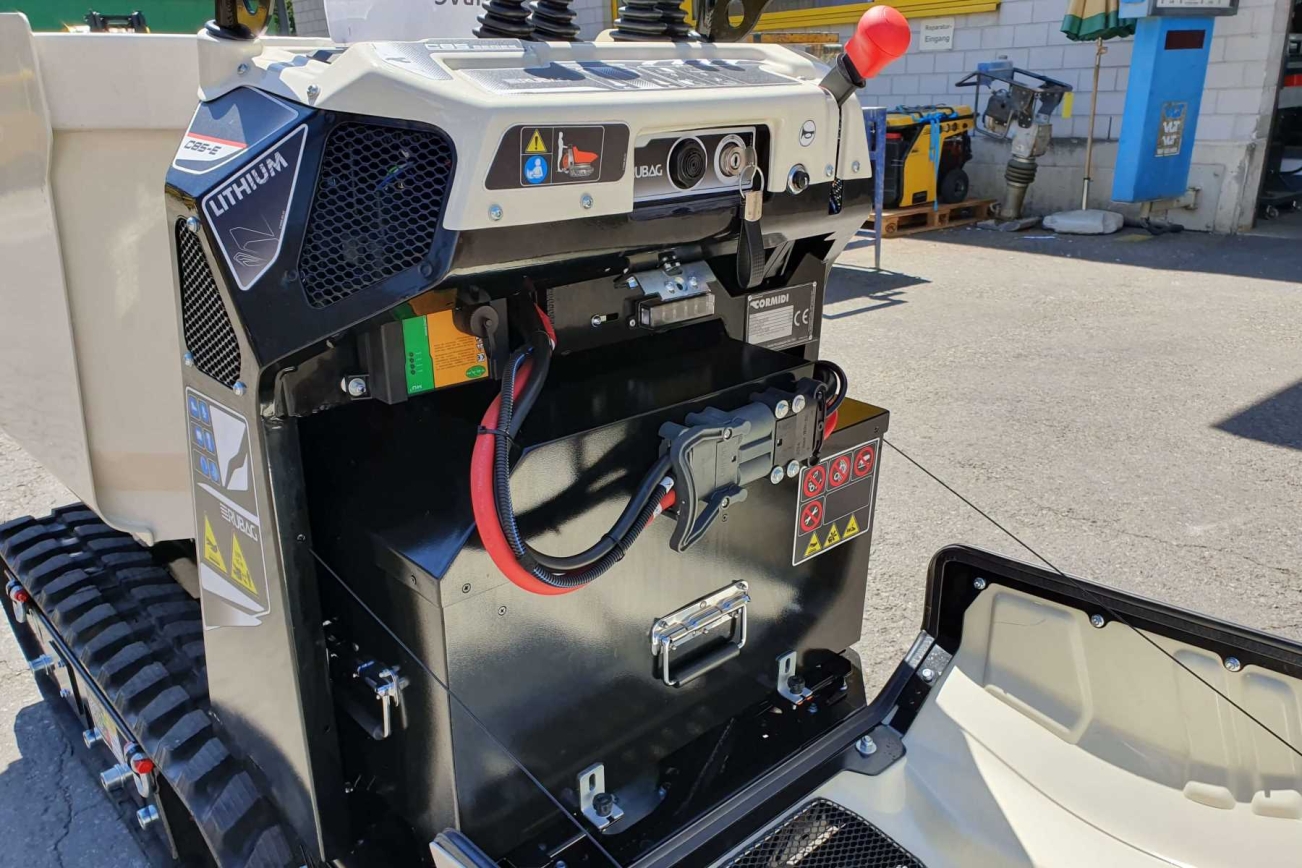 Die Ladezeit dieses Elektro Minidumpers beträgt mit einem 230 V Anschluss rund 5 Stunden, mit 400 V nur 2.5 Stunden.