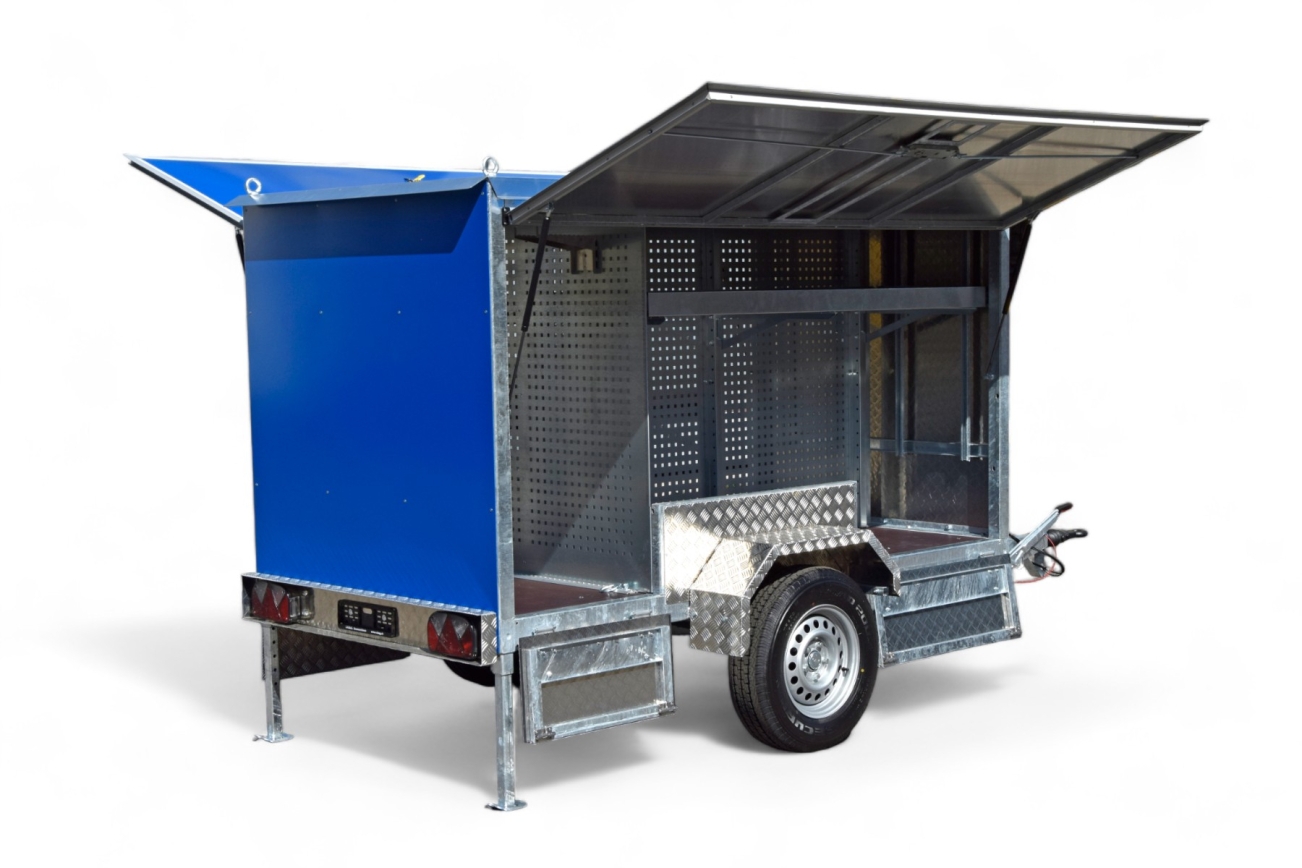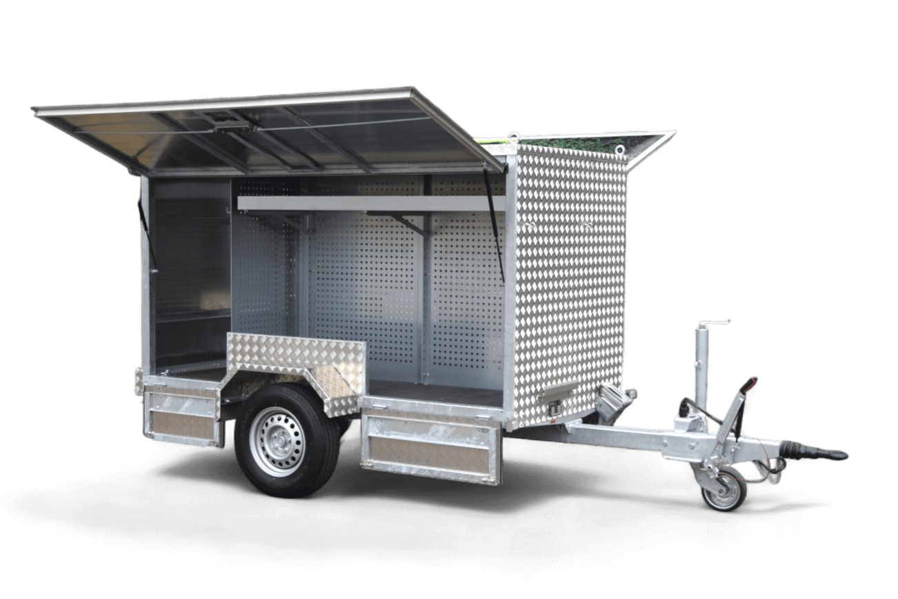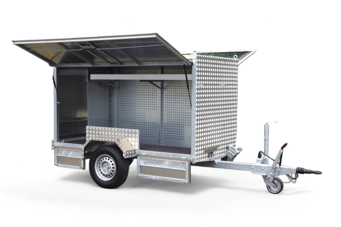 Große Flügeltüren Die Flügeltüren erstrecken sich beidseitig über die gesamte Länge des Anhängers und bieten perfekten Zugang zum gesamten Stauraum. Dank der Gasdruckfedern lassen sich die Türen sanft öffnen und schließen.