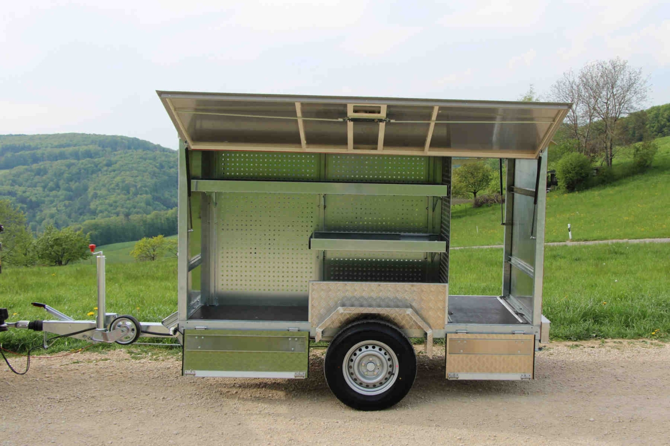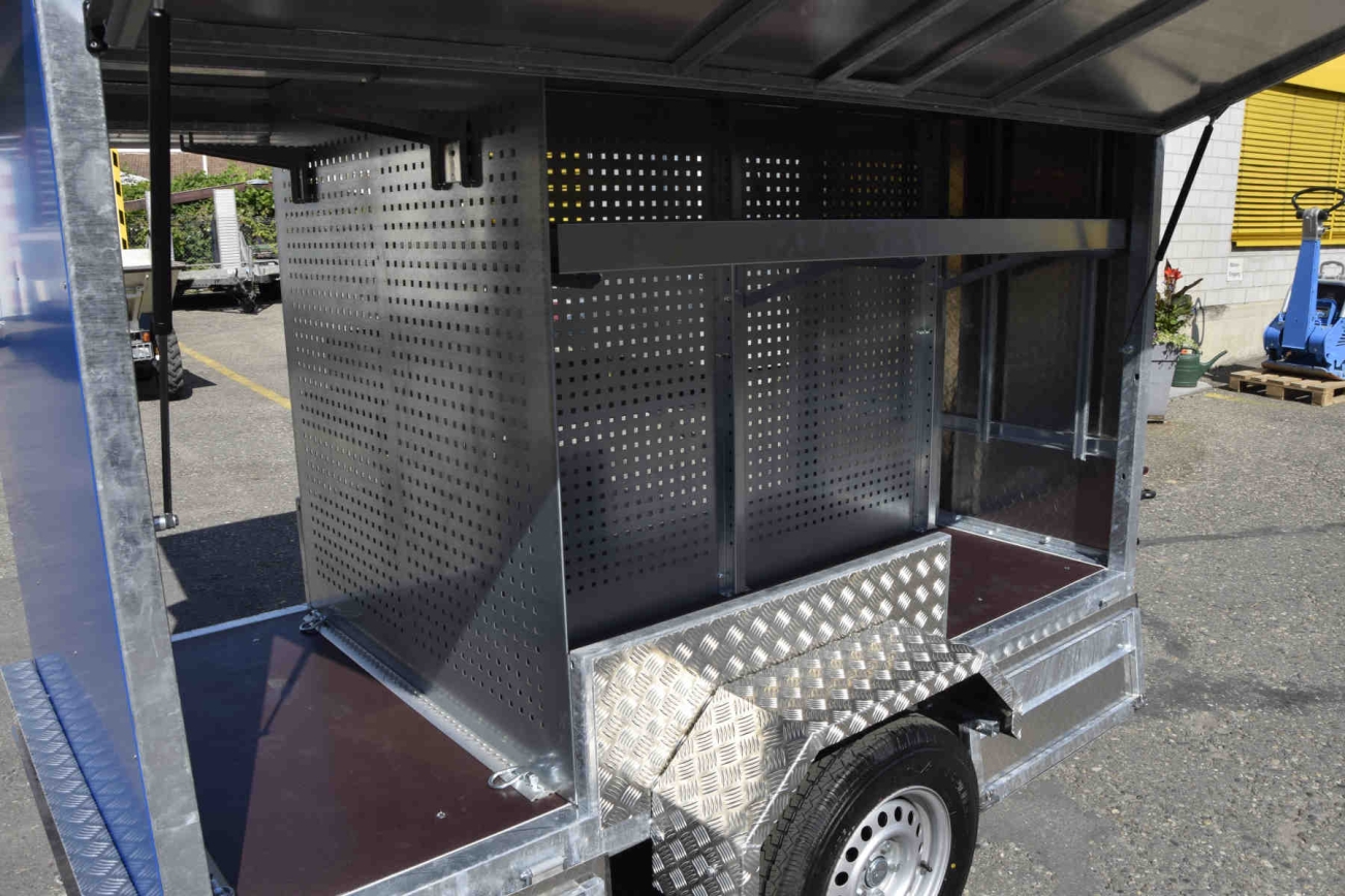 Verstellbare Tablare Standardmäßig ist dieser Materialanhänger mit einem kurzen und zwei langen Tablaren ausgestattet. Alle Regale sind in der Höhe verstellbar und somit flexibel an Ihre Bedürfnisse anpassbar. Auf Wunsch können Sie die Inneneinrichtung mit weiteren Ablagebrettern erweitern.