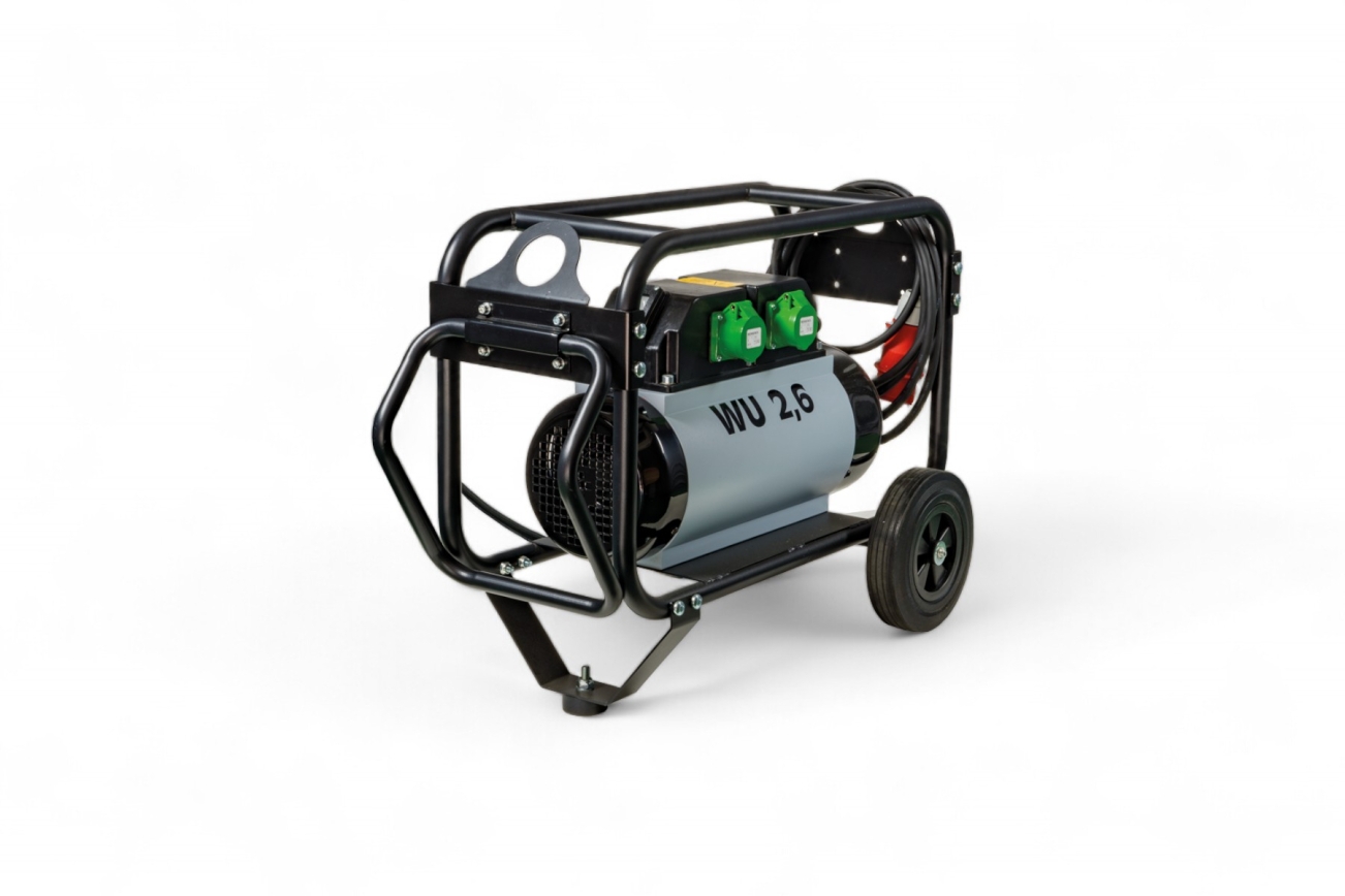 - Leicht und transportfreundlich: Die Umformer WU sind leicht zu transportieren - insbesondere die Typen WU 2.6 und 4.0 punkten mit zusätzlich integriertem Fahrwerk. Ein Rohrrahmen schützt alle WU-Umformer und dient als praktischer Tragegriff.