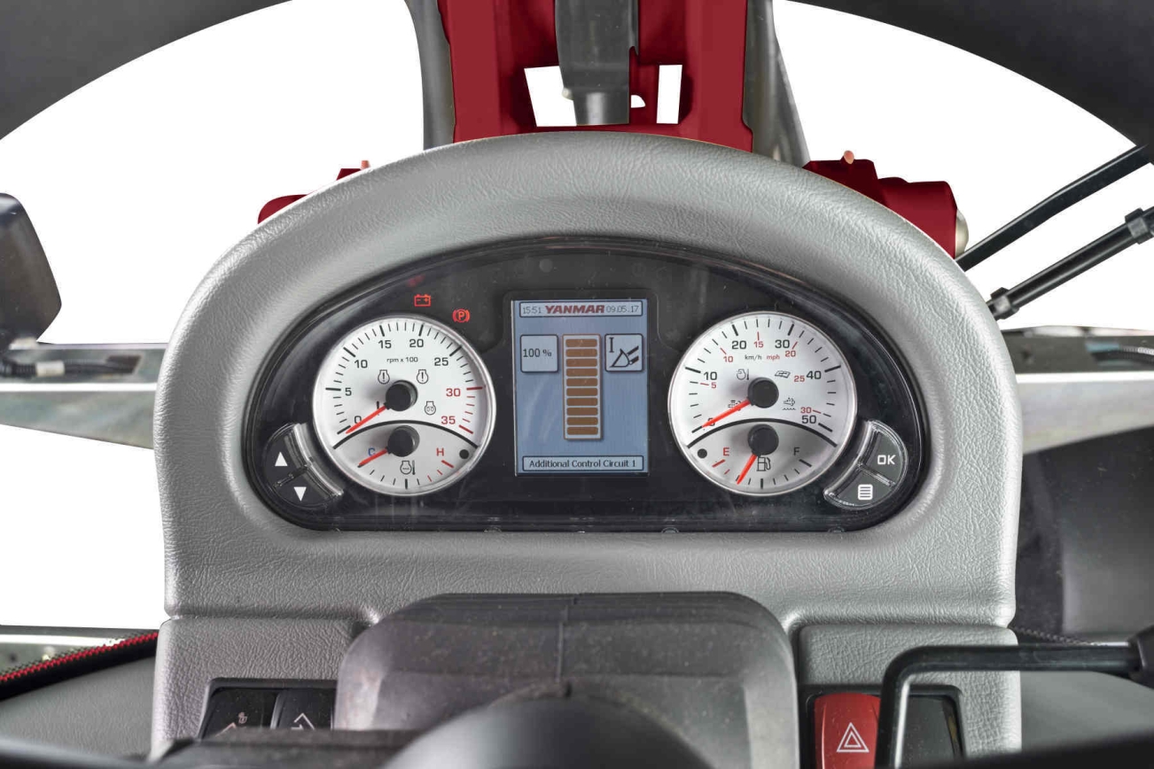 Fahrerstand & Komfort: Geräumige, elastisch gelagerte Vollsicht ROPS Komfortkabine für ermüdungsarmes Arbeiten. Beidseitiger Einstieg dank 2 Türen, Panorama-Sicherheitsverglasung, Fahrersitz mit hydraulischer Dämpfung, entspiegeltem 3,5-Zoll-Display, Heizung und Radio DAB+. Smart Control-Betriebssystem für einfachste und präzise Bedienung.