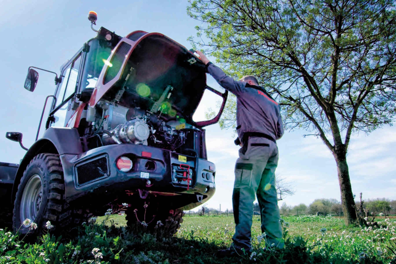 - Antrieb und Traktion: Hydrostatischer Fahrantrieb mit Untersetzungsgetriebe. Geschwindigkeit 30 km/h. Allradantrieb mit Selbstsperrdifferenzial über die Gelenkwelle zur Vorderachse. Hydraulische Bremsanlage über Allrad auf alle 4 Räder wirkend. Hinterachse mit Pendeldämpfung.