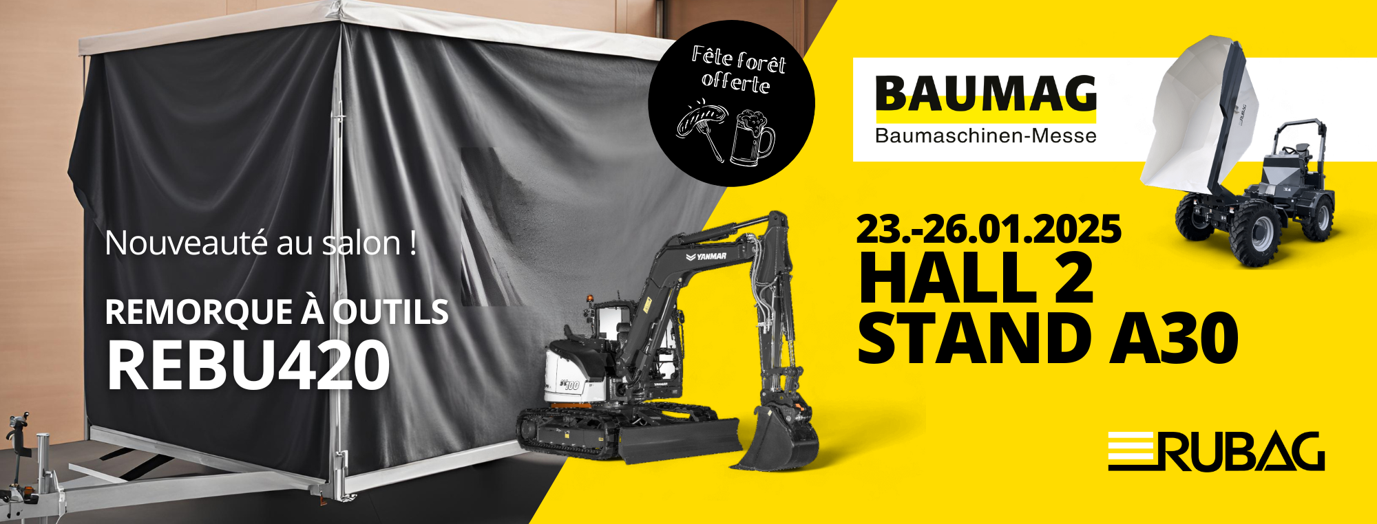 Du 23 au 26 janvier 2025, la BAUMAG Lucerne sera à nouveau le point de rencontre de l'industrie suisse de la construction - et nous y serons bien entendu présents, comme d'habitude ! Venez nous rendre visite sur notre grand stand dans la halle 2, stand A30, et découvrez notre gamme de produits variée de machines de chantier, remorques, engins de chantier et accessoires de marques renommées.