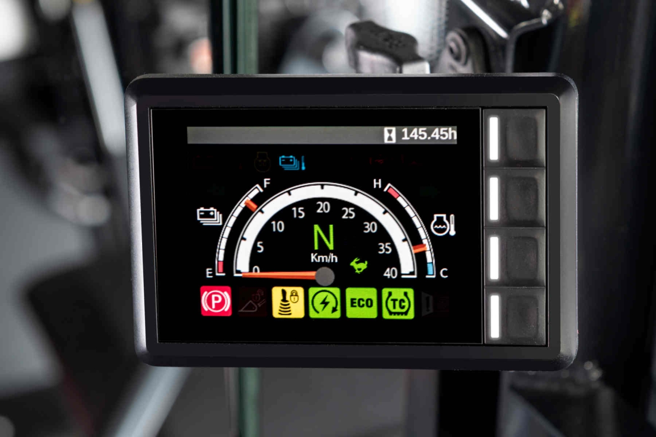 - Poste de conduite & confort : Cabine confortable certifiée ROPS FOPS avec 2 portes pour un accès des deux côtés. Siège confort à amortissement hydraulique avec chauffage de siège, colonne de direction réglable, dégivrage de vitre, chauffage, radio DAB+, écran couleur 3,5 pouces. Système de commande YANMAR Smart Control, y compris quatre modes de travail : mode godet, mode fourche, mode éco et mode puissance.