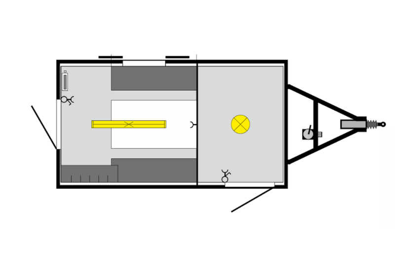 - Type E à partir de 4 m de longueur : 1 compartiment d'équipe (meublé) et 1 compartiment de matériel (vide, uniquement avec installation électrique)