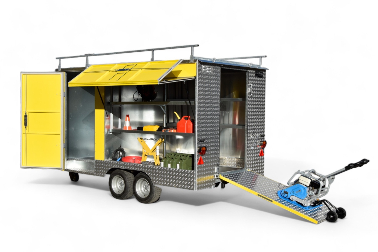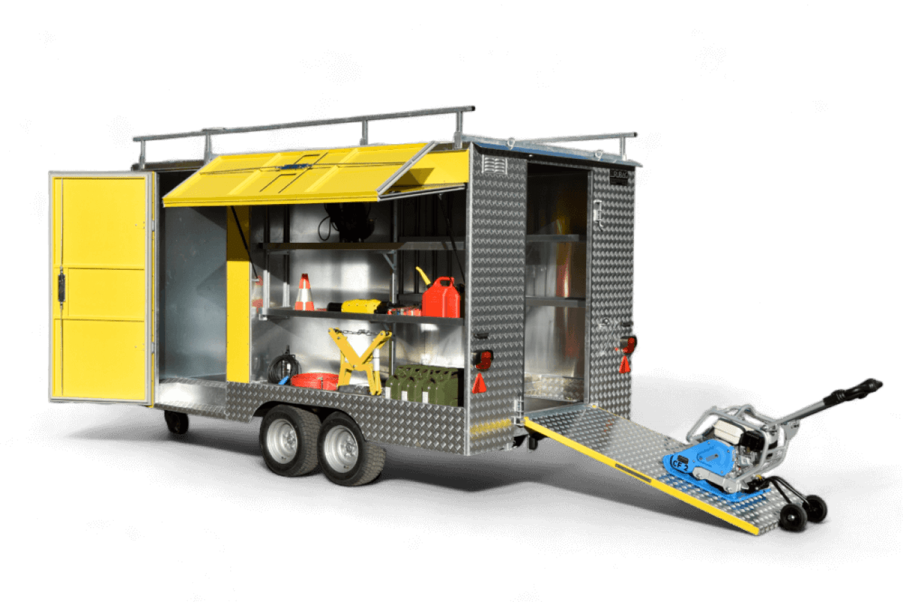 Cette remorque est bien plus qu'une simple remorque à transport. Elle réunit les avantages des roulottes de chantier classiques avec un compartiment pour le matériel et l'équipe, et les surpasse par une excellente accessibilité des étagères depuis l'extérieur et une rampe pratique pour le chargement des machines lourdes. Que demander de plus ? Découvrez tous les avantages et les caractéristiques d'équipement qui font de cette remorque de chantier la classe royale.