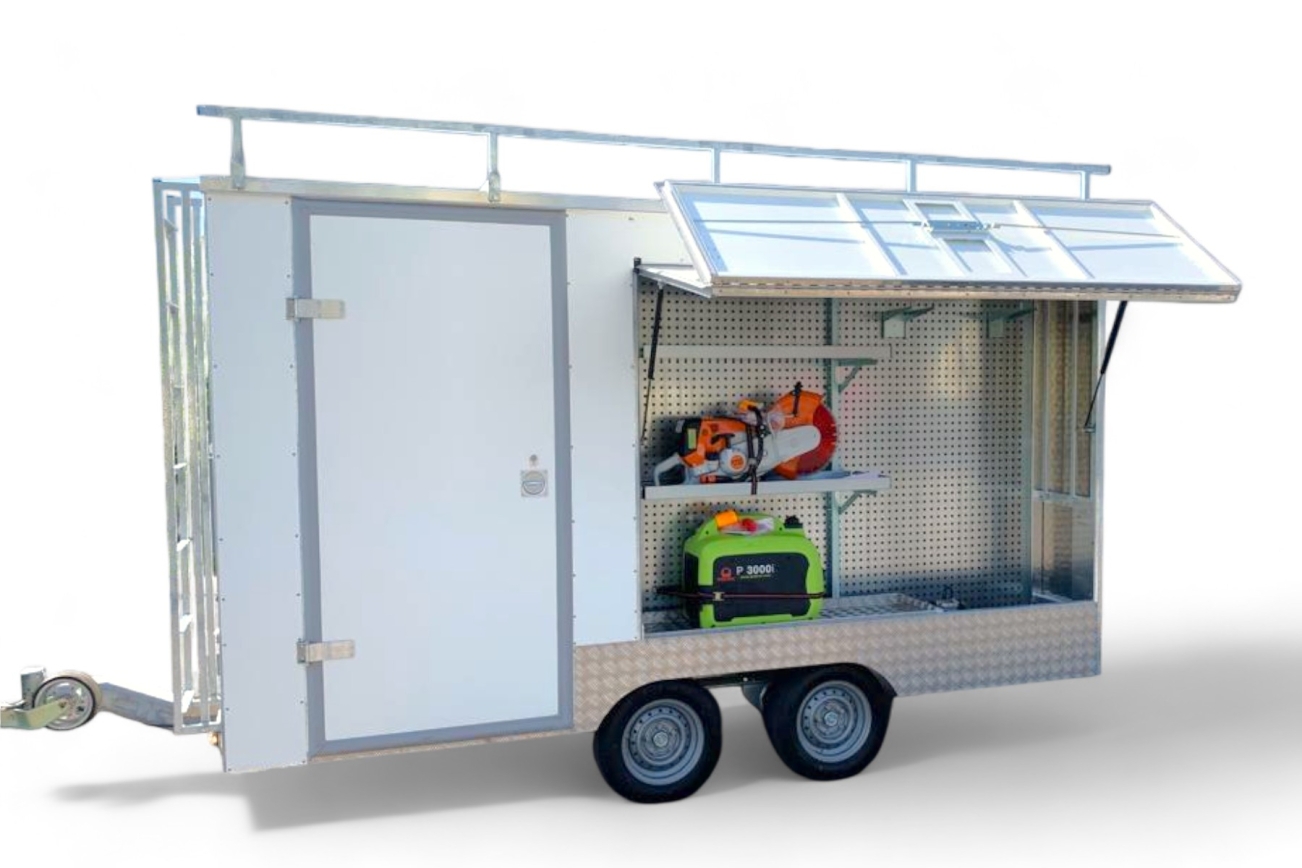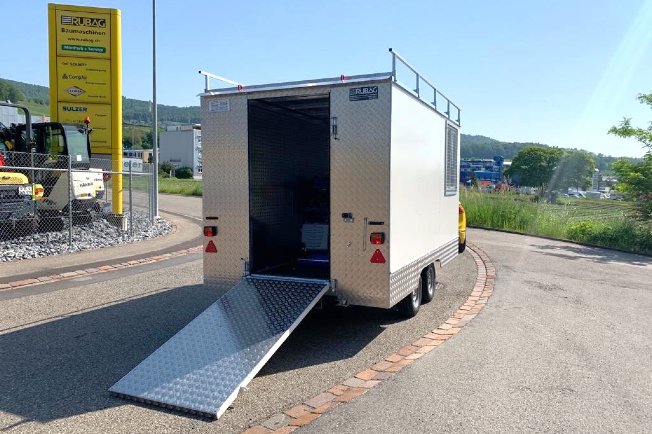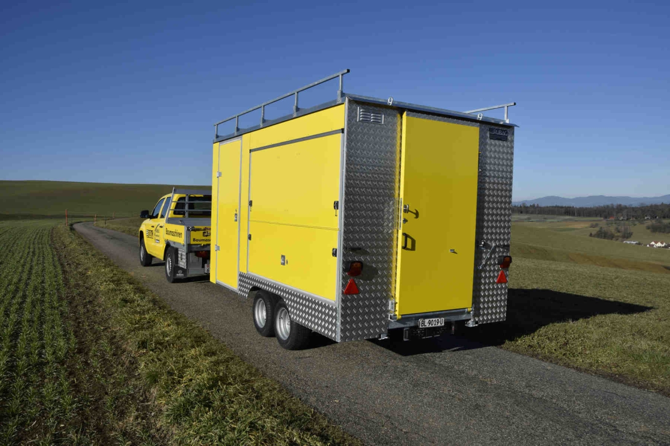 La REBU type 360 est la seule remorque à outils RUBAG qui fait également office de petit véhicule d'équipe grâce à son compartiment séparé pour le polissage ou l'équipe. Le compartiment avant est équipé d'une installation électrique de 230 V et peut être aménagé de manière flexible en salle de pause ou en bureau de chantier, selon vos besoins.