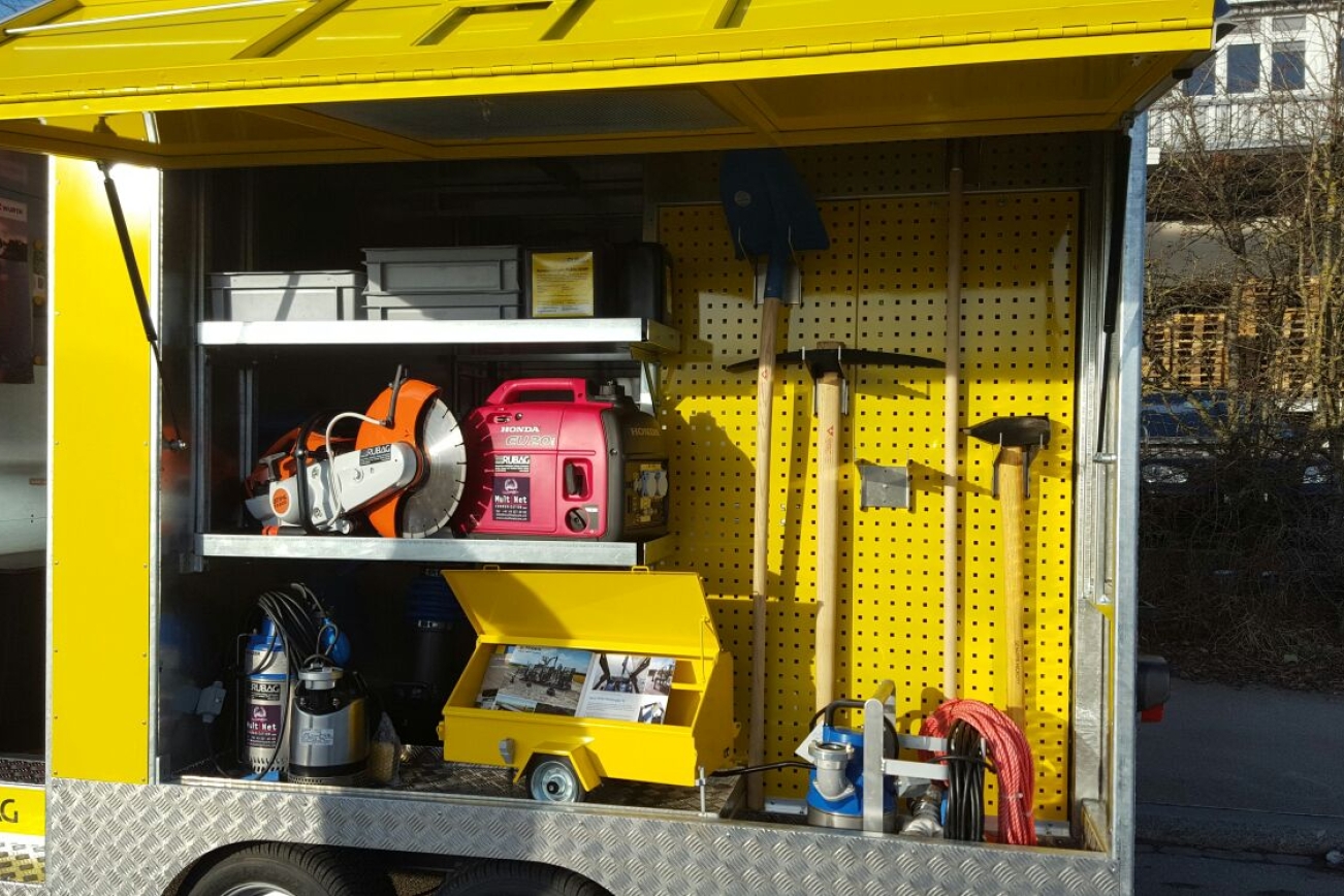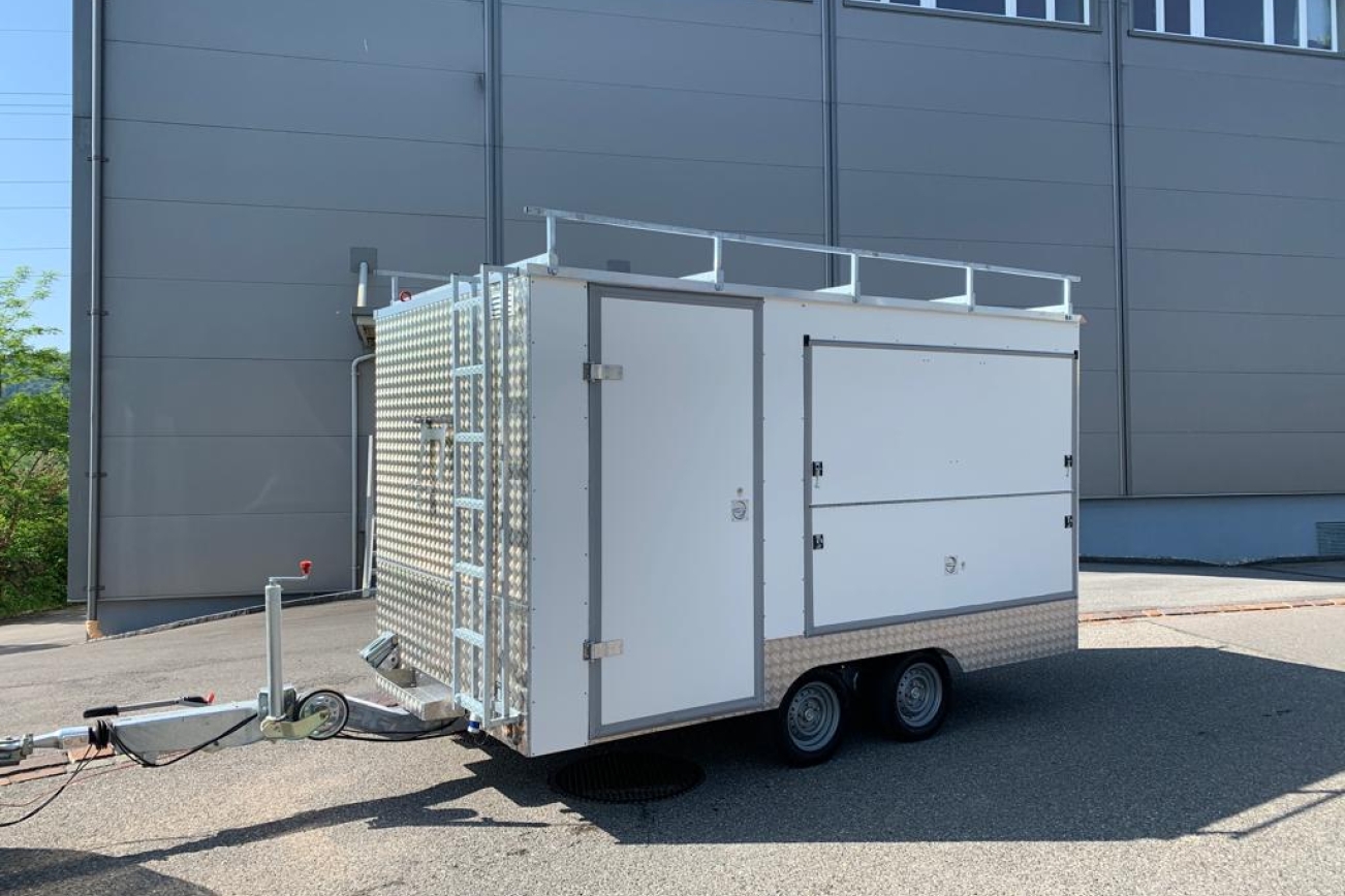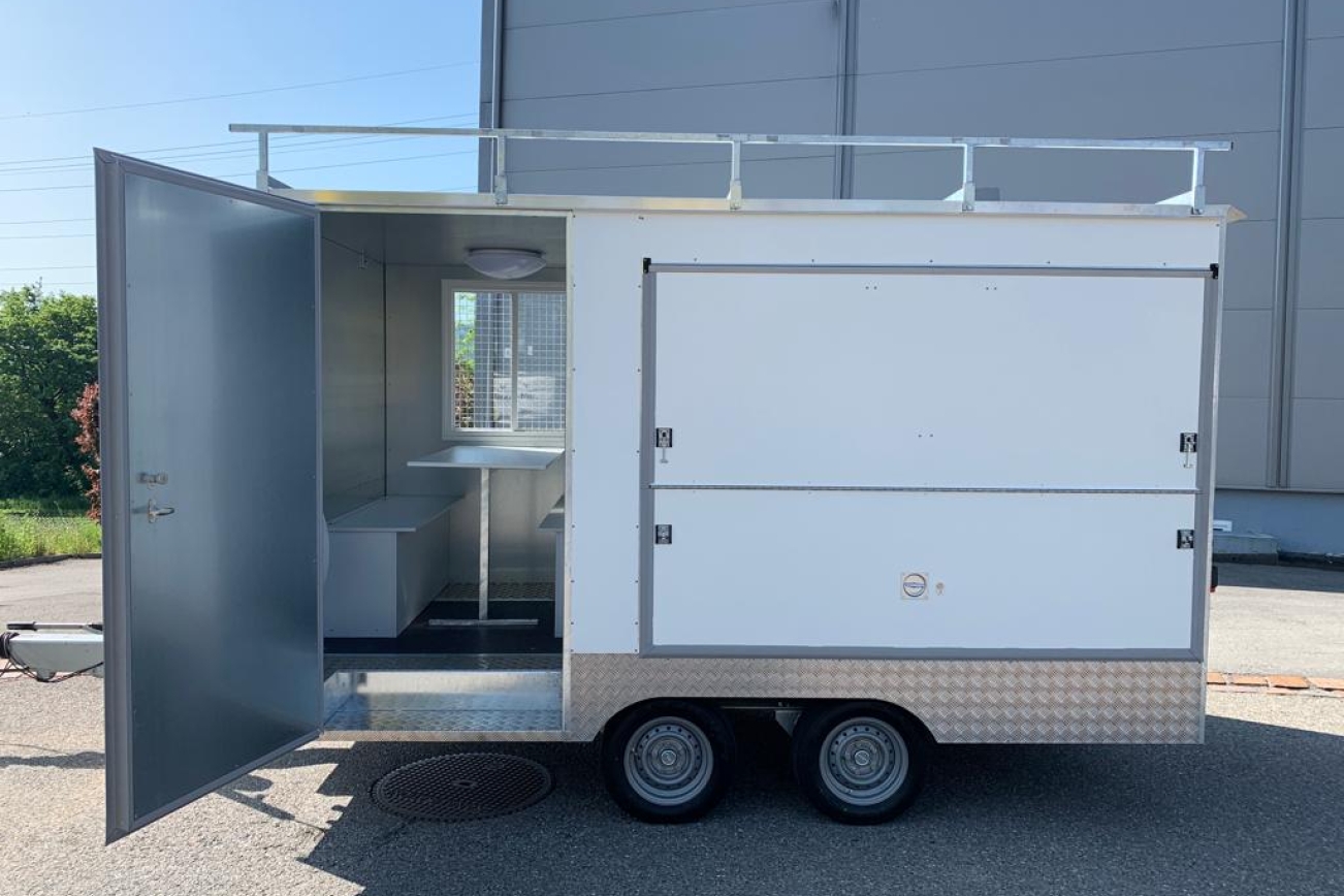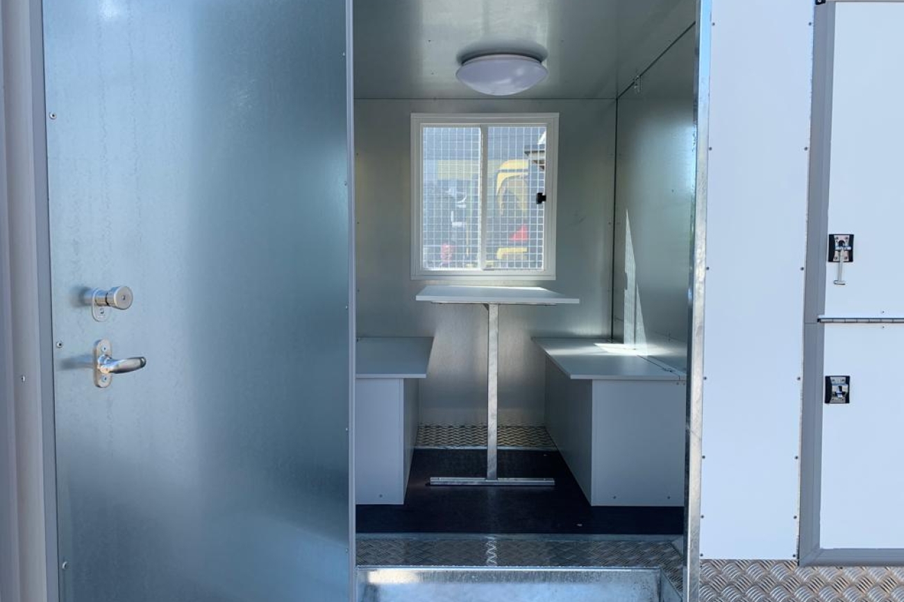 La REBU type 360 est la seule remorque à outils RUBAG qui fait également office de petit véhicule d'équipe grâce à son compartiment séparé pour le polissage ou l'équipe. Le compartiment avant est équipé d'une installation électrique de 230 V et peut être aménagé de manière flexible en salle de pause ou en bureau de chantier, selon vos besoins.