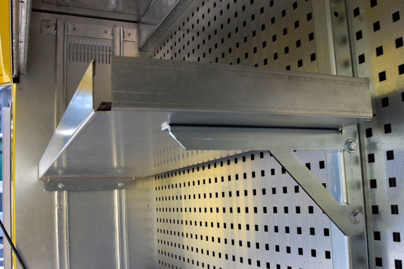 En plus du compartiment avant, cette remorque à outils dispose d'un grand compartiment accessible pour le matériel et les outils. L'accès se fait par une porte-rampe combinée, ce qui rend le chargement et le déchargement d'outils mobiles particulièrement pratique. Sur les côtés, des étagères et des porte-outils permettent d'organiser clairement votre équipement. Ce compartiment est également équipé en standard d'un bac à bidons et de rails de fixation pour l'arrimage du chargement.