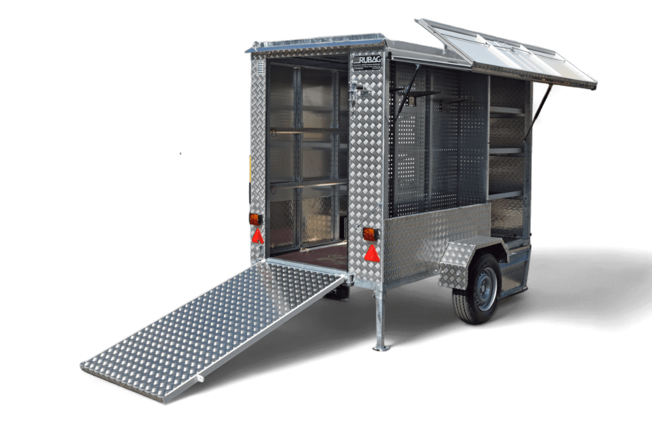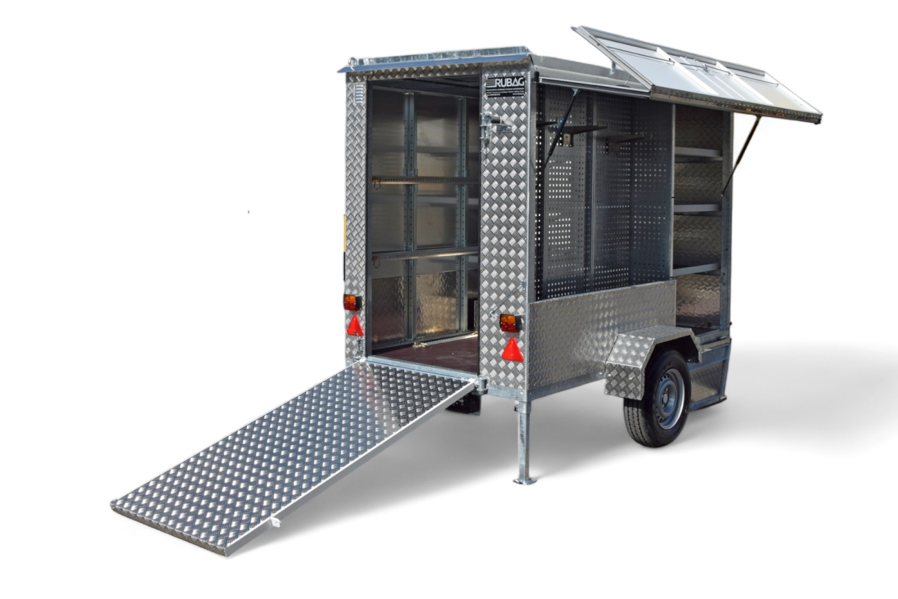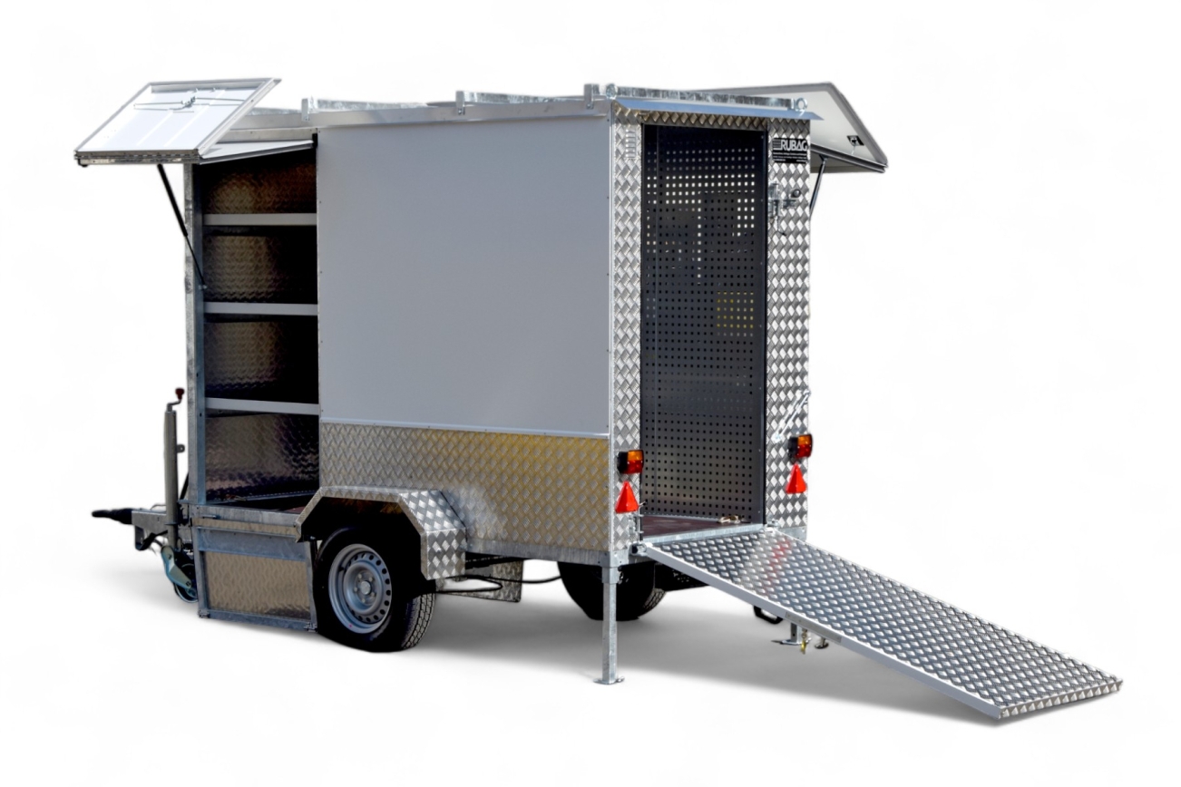 Cette remorque à outils est le seul modèle REBU à être équipé d'un compartiment continu comprenant trois étagères sur toute la largeur de la remorque. Ceux-ci sont accessibles de l'extérieur des deux côtés, l'accès se faisant à chaque fois par une porte pliante.