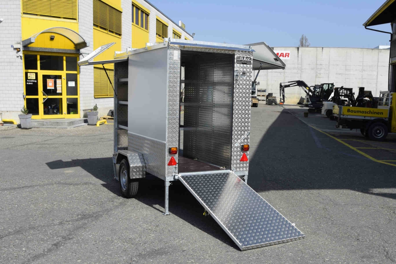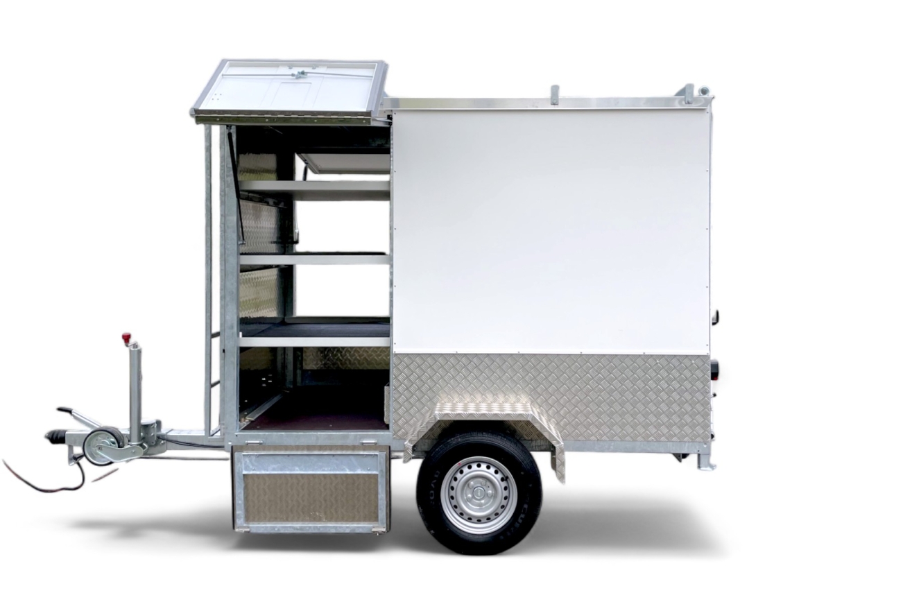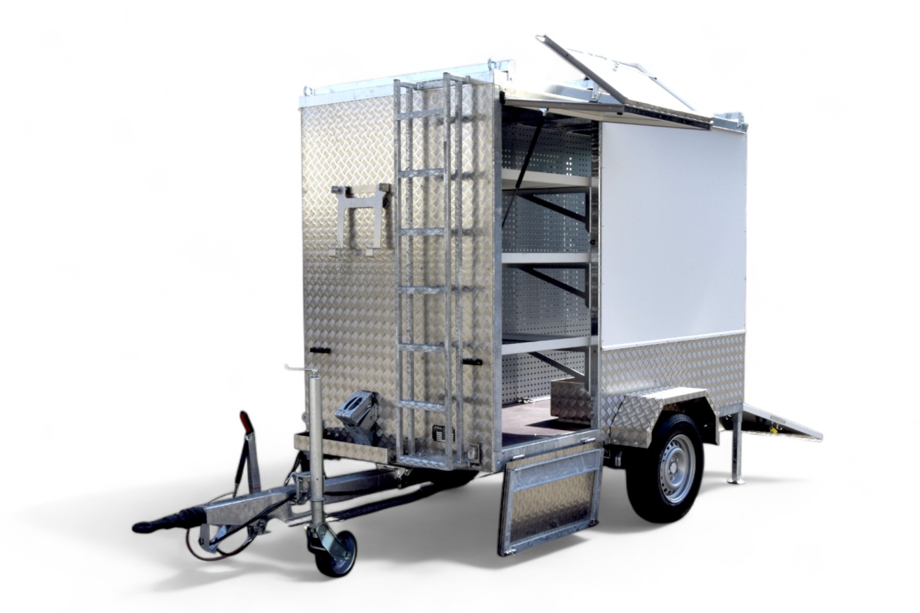 Cette remorque à outils est le seul modèle REBU à être équipé d'un compartiment continu comprenant trois étagères sur toute la largeur de la remorque. Ceux-ci sont accessibles de l'extérieur des deux côtés, l'accès se faisant à chaque fois par une porte pliante.