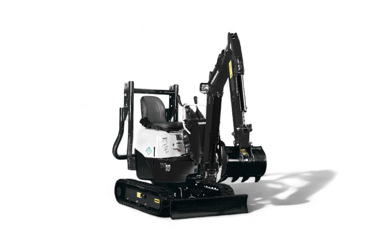 La mini-pelle ViO10 appartient à la catégorie des micro-pelles en raison de son faible poids et de ses dimensions compactes. Sa largeur totale n'est que de 830 mm. Le châssis inférieur est télescopique hydrauliquement jusqu'à une largeur de 1000 mm. L'arceau de sécurité peut être rabattu pour passer sous les obstacles.